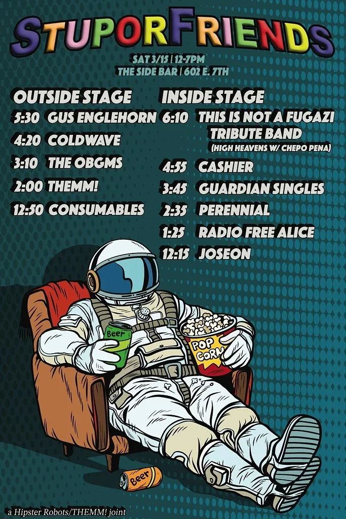 And to prove that point, we’ve added a SECOND show to our SXSW musical offerings — STUPORFRIENDS. This is the show we do in conjunction with our friends — and we use that word very, very lightly (have you MET them?!?) — THEMM! And while it has a different name, it’s basically the same dumb show, just with slightly more focus on international bands and first-time SXSW bands with, you know, too many guitarists. Oh and THEMM! make us book them too. Dicks.